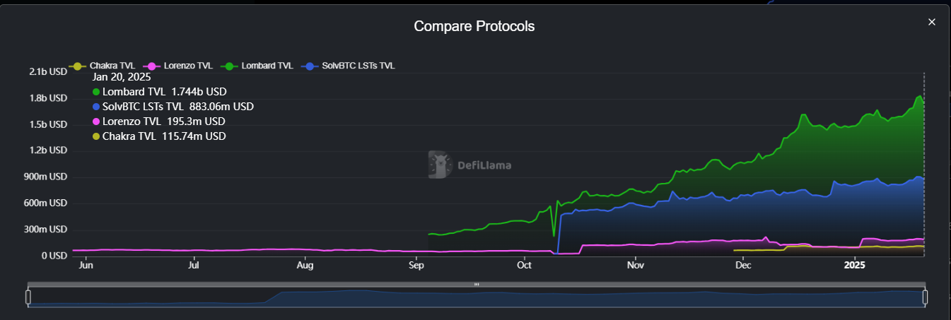 - Lombard: Leads with $1.744B TVL, holding the largest market share among all protocols. This protocol has demonstrated consistent growth, surpassing competitors since October 2024, and maintaining a steady growth rate.