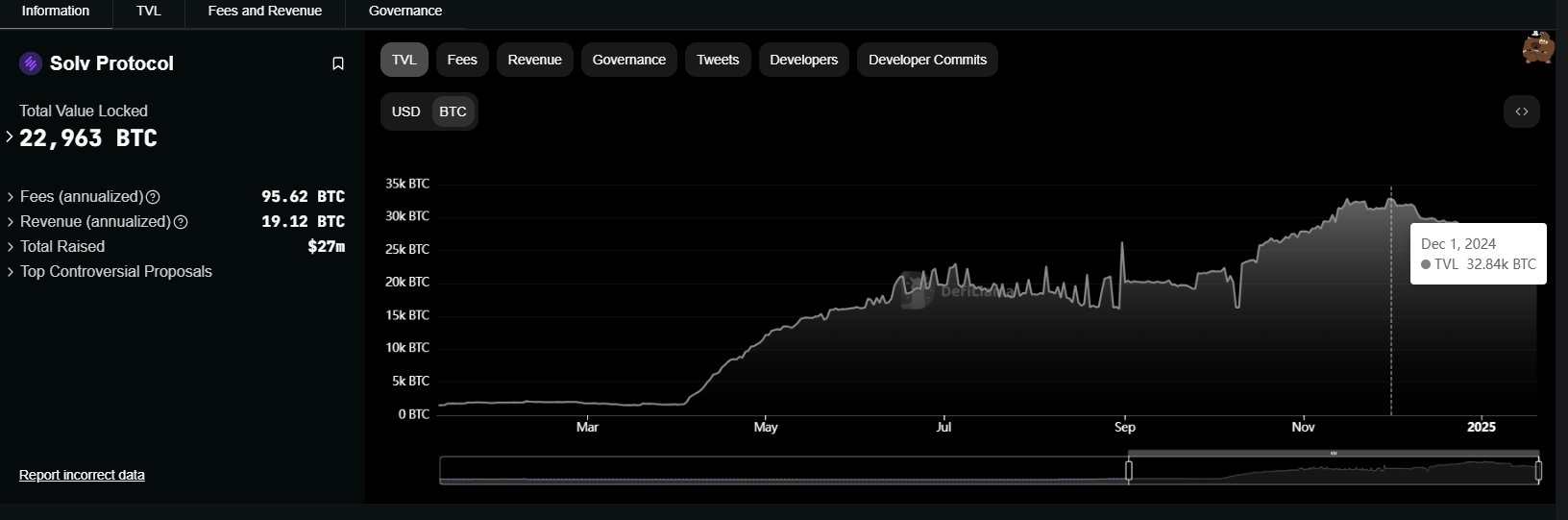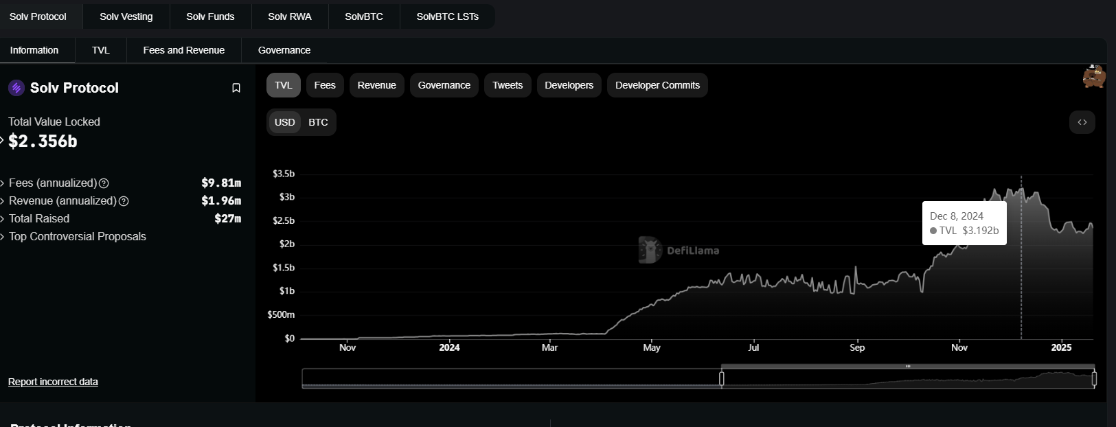 Solv’s current Total TVL (USD) is recorded at $2.3B, which corresponds closely with Total TVL (BTC). Both metrics move in sync, showing no significant discrepancy, indicating that the decrease in TVL (USD) is influenced by Bitcoin’s price fluctuations in the market.