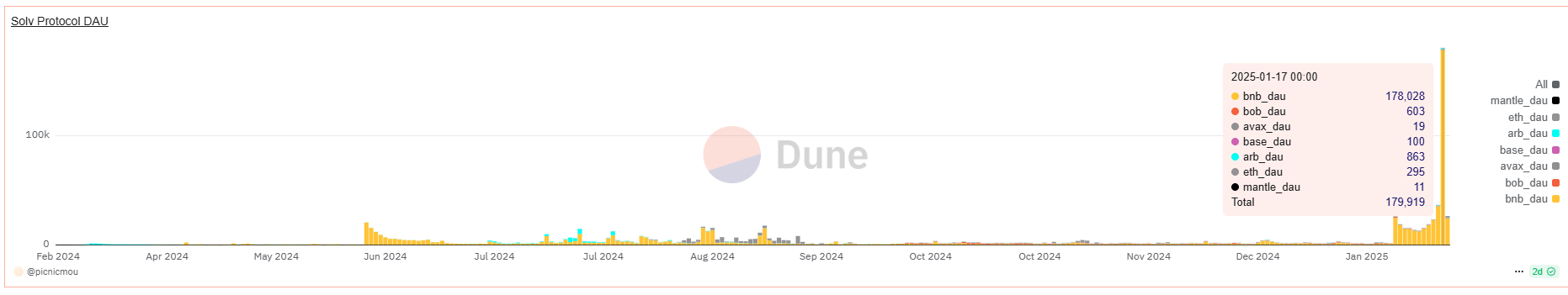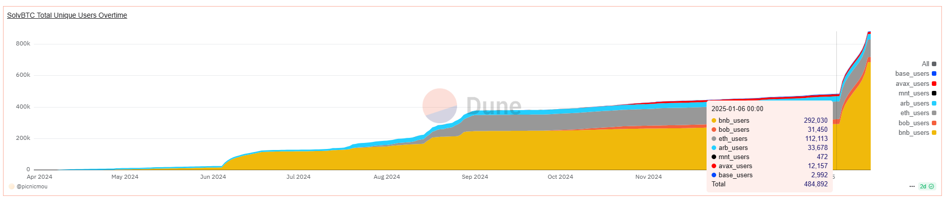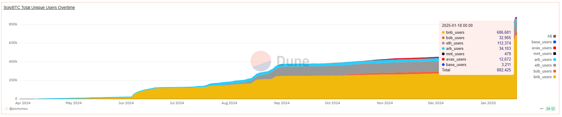 - Market Position: Solv Protocol ranks second in BTCFi Restaking market share, boasting a TVL of $2.4B, trailing only Babylon, and has amassed 800k total unique users.