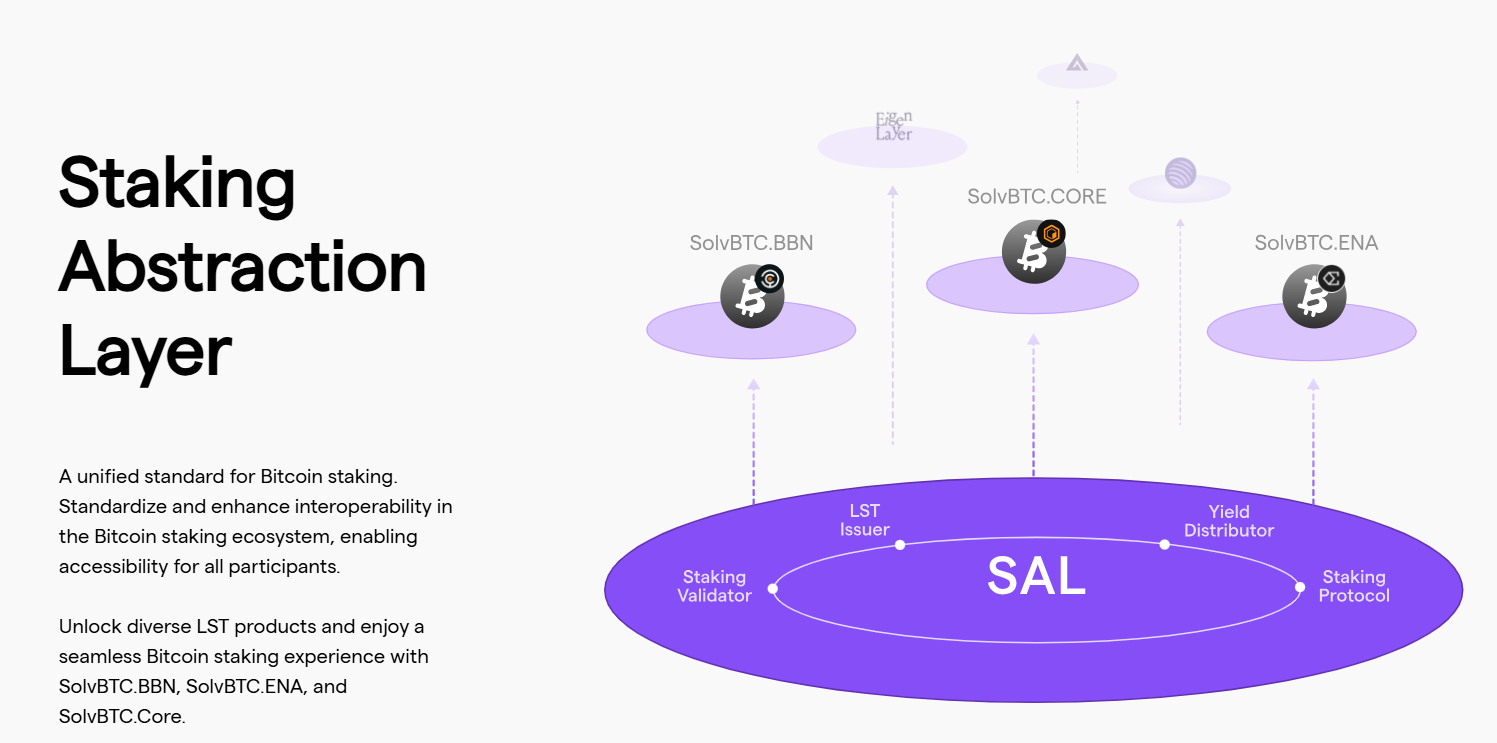 Solv Protocol is a restaking protocol for Bitcoin, currently supporting multiple chains but primarily focused on native Bitcoin. Utilizing its Staking Abstraction Layer (SAL) technology, Solv Protocol provides a seamless and transparent Bitcoin staking experience, enabling users to enhance their returns and expand their access to BTCFi.