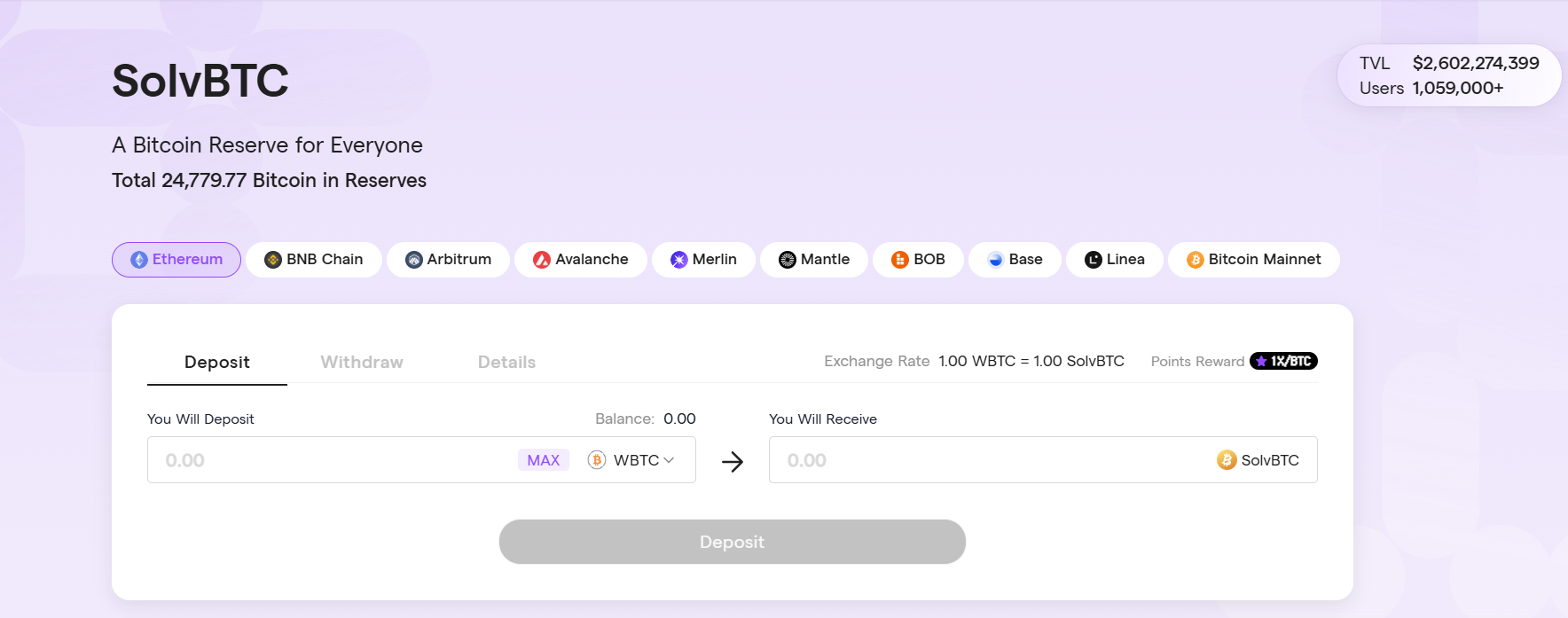 Note: Staking $BTC for $SOLV.BTC does not directly generate yield. Instead, users can utilize the protocol’s DeFi Vault products to seek yields through DeFi.