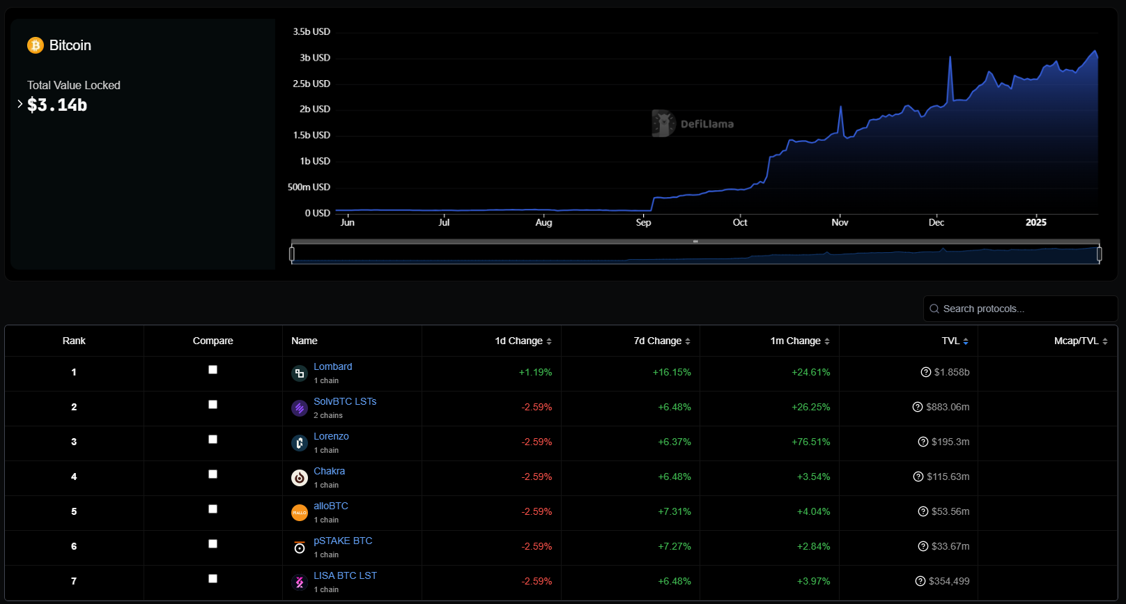 The BTC Liquid Restaking sector currently has a Total TVL of $3.14B (excluding Babylon, which falls under the Restaking sector, not Liquid Restaking). Recorded in December, the TVL was $2.7B, indicating a growth of over 24% to date. This increase has been driven by the recent surge in Bitcoin’s price.